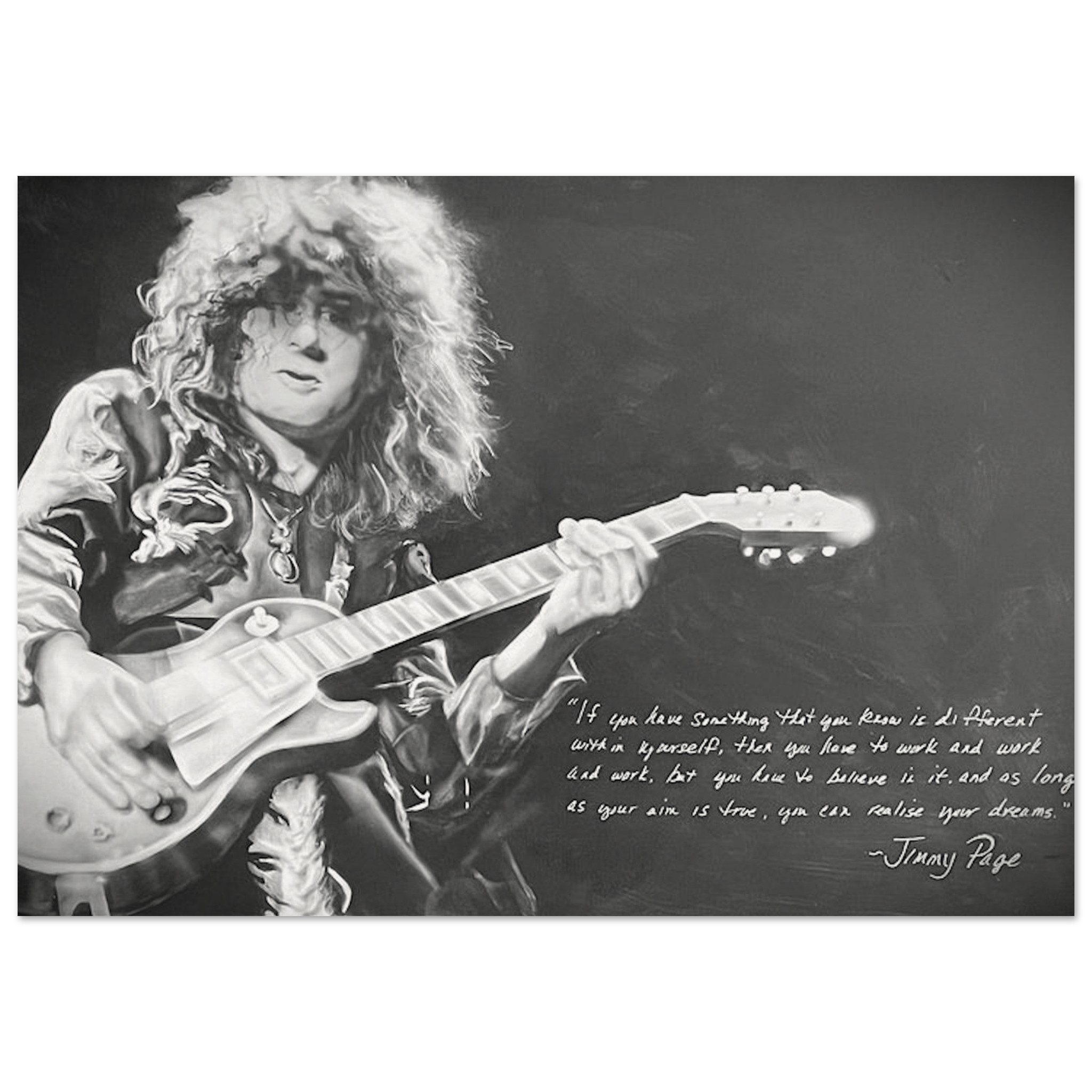 Elevate your space with our stunning print featuring a black and white portrait print of the legendary Jimmy Page from Led Zeppelin. Accompanied by one of his most inspiring quotes, this timeless piece of art not only captures the essence of rock ‘n’ roll but also serves as a daily reminder of creativity and passion.
